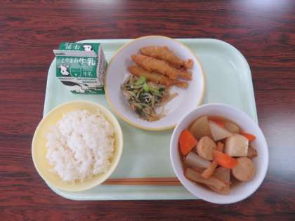 今日の献立は、ご飯 おでん わかさぎのフリッター 昆布和え 牛乳 でした。
