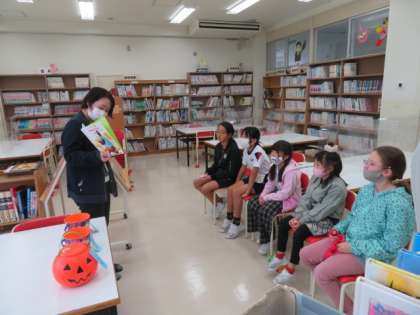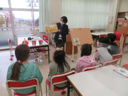 昼筆休憩に、第2回の英語の絵本の読み聞かせが行われました。1年生の国語の教科書にも載っている「はなのみち」です。とても分かりやすくお話でした。最後にはお楽しみ抽選会です。