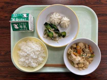 今日の給食は ごはん 炒り豆腐 きゅうりとわかめの酢の物 えび包子 牛乳 でした。