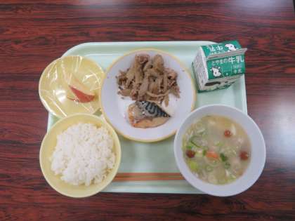 今日の献立は、ご飯 なめこのみそ汁 鯖の塩焼き 茎わかめのきんぴら リンゴ 牛乳 でした。