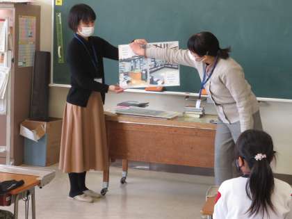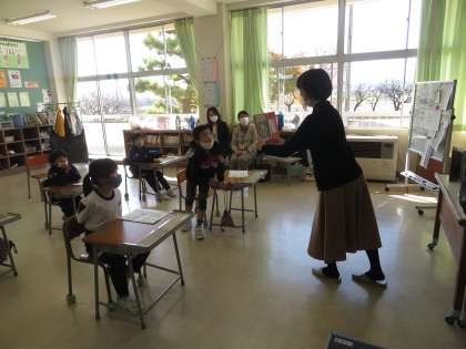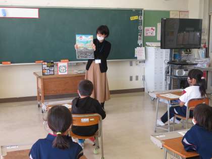 富山市立図書館分館の職員の方々に来ていただきました。図書館の説明や絵本の読み聞かせをしていただきました。本にもっと興味がわく時間になりました。