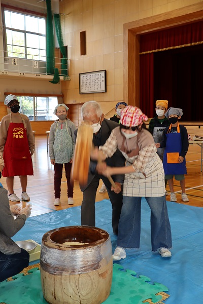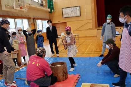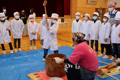 大中小の中から自分に合う杵を選び、臼の中心をねらって餅をつきました。