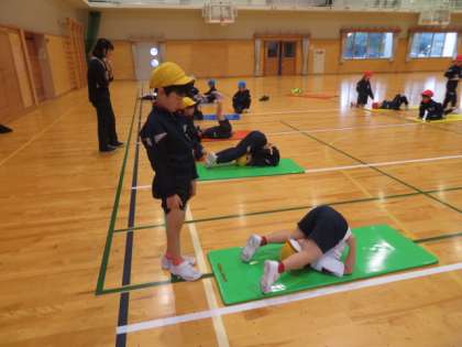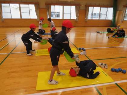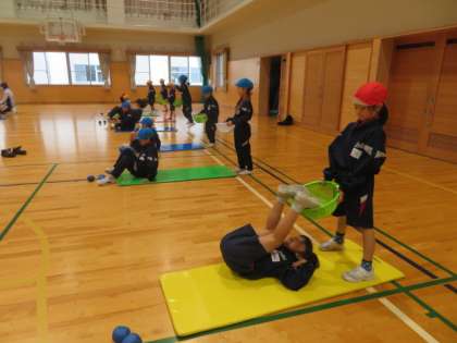 体づくりの運動に取り組んでいます。柔軟な体で、難し技にも挑戦していました。