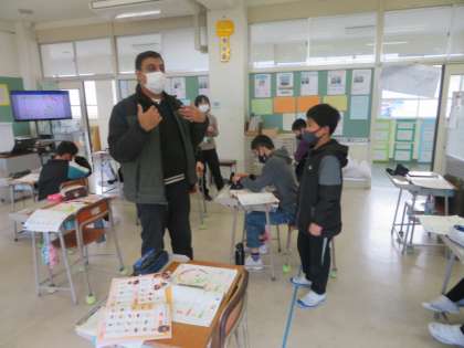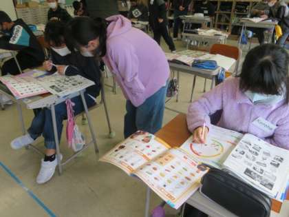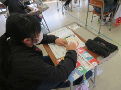 いろいろな食材を赤黄緑の食品群に分け、英語で答えています。家庭科の学習で、たっぷりと勉強した栄養素。さすが6年生です。
