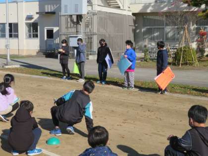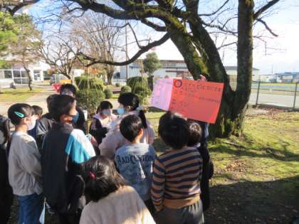 大休憩時に、環境委員会が企画した「動植物クイズラリ」が行われました。雨のため延期となっていましたが、好天のもと、縦割りなかよし班で、いろいろなクイズに挑戦しました。