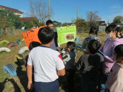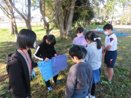 「校庭の桜の木は何本?」「カナヘビのえさは何?」「学校で飼っている金魚の色は何色?」学校の生き物に関するクイズがたくさん出題され、班で仲良く話し合って考えていました。