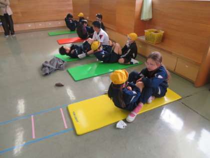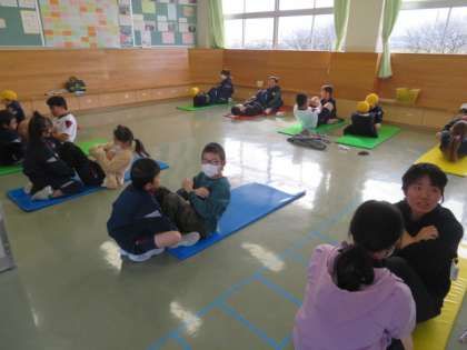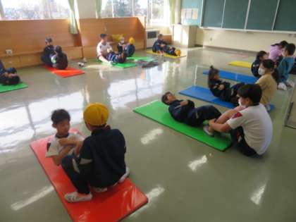 冬期間の体力つくりのために、大休憩に「体力つくりタイム」がスタートしました。縦割り班ごとに3つの場所に分かれ、体力作りに取り組みます。多目的室では、ストレッチと上体起こしです。