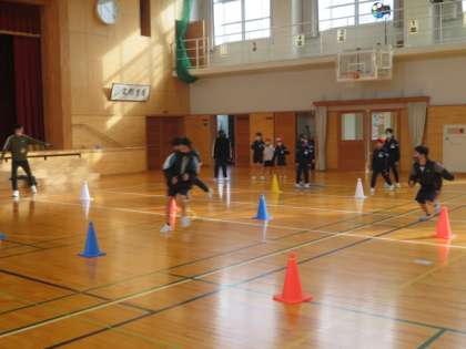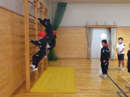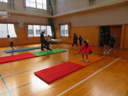 体育館では、切り返し走、立ち幅跳び、肋木 です。次回は班ごとに場所をローテーションして行います。