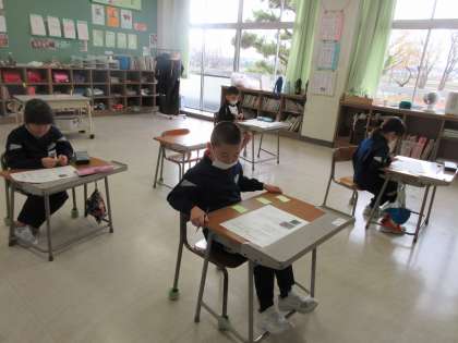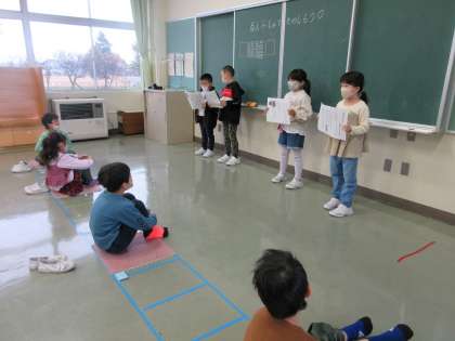 国語科で書いた「おもちゃの作り方の説明書」をみんなで読み合い、友達の説明の上手なところを伝え合いました。「出来上がったら1年生に見せる」という目当てで活動していたので、1年生に「ぜひ見てください」と説明書を渡しました。