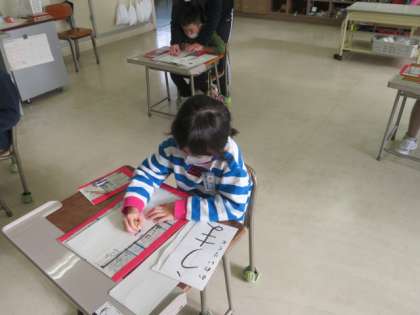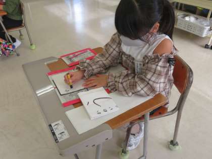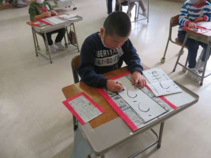 書き初め練習が始まっています。文字は「竹うま」中心線を考え、一文字一文字丁寧に書くことができるよう練習しています。