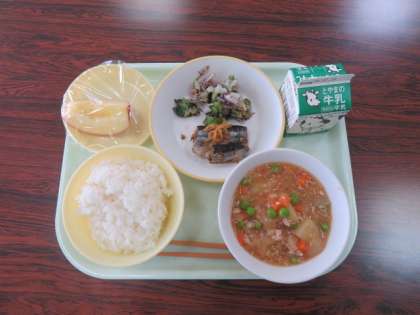 今日の献立は、ご飯 じゃがいものそぼろあん さんまのショウガ味 ゆかり和え りんご 牛乳 でした。