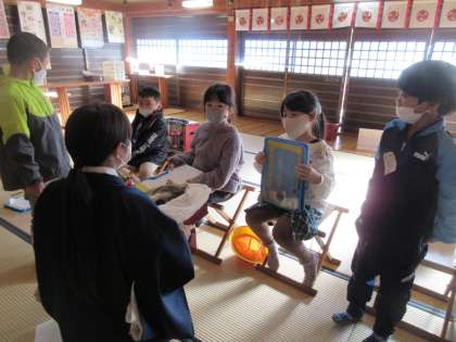 生活科の学習の町探検で、八幡宮に行ってきました。どうして「八幡」という名前が付いているのか、どんなお仕事をしているのかなど、いろいろなことを教えていただきました。神楽を舞うときの鈴ももたせていただき、すてきなところをたくさん発見できました。