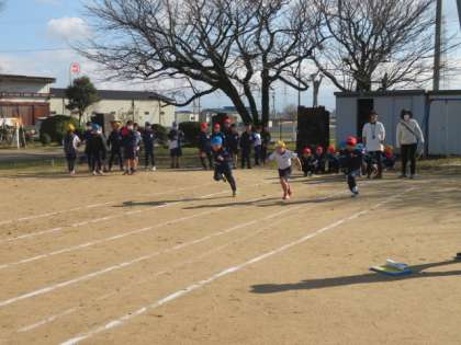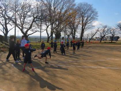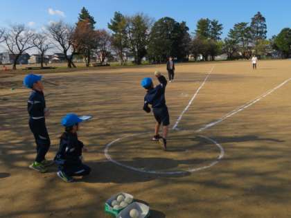ソフトボール投げと50m走の記録を測りました。青空のもと、気持ちよく体を動かしています。