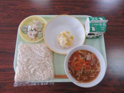 今日の献立は、ソフト麺の五目あんかけ れんこんサラダ 蒸しパン 牛乳 でした。
