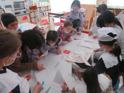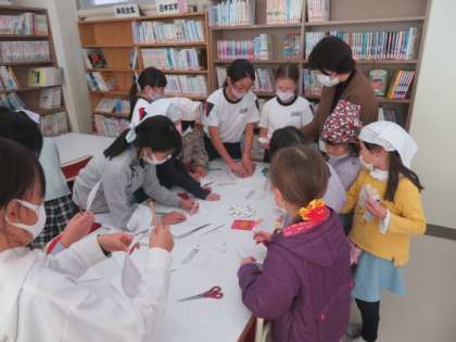 図書館司書の先生による大型絵本の読み聞かせが行われました。その後、本のしおりやクリスマスツリーを作るイベントが開かれました。会場となった図書室は大盛況。あっという間の時間でした。