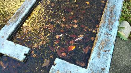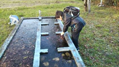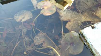 朝、観察池に氷が張っていました。その中で、メダカが頑張って泳いでいました。