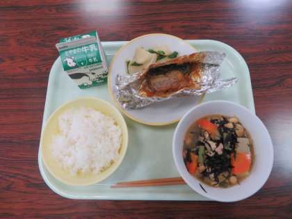 今日の献立は、ご飯  大豆のいそ煮  鯖の銀紙焼き  かぶの彩り  牛乳 でした。