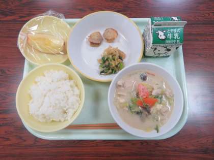 今日の献立は、ご飯 ごま豆乳なべ ホタテの香味焼き はりはり和え リンゴ 牛乳 でした。