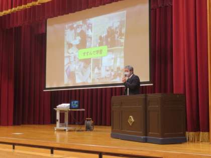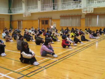 校長生から、子供たちが2学期に「金メダル級」の活躍をした様子や、冬休みは家庭が活躍の場であるといったお話があり、子供たちは真剣に聞いていました。マスクを着用してピアノ伴奏に合わせて久しぶりに全校で校歌を歌いました。