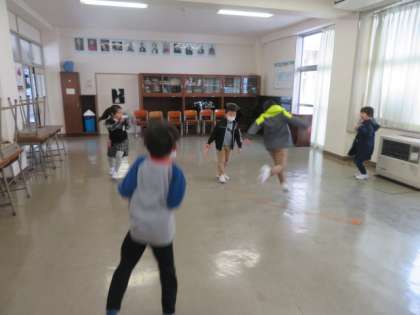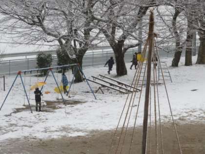 雪がちらつく昼休み、思い思いに楽しく遊んでいます。