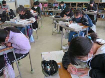 人口のグラフを見て気付くことをまとめています。授業に集中しています。