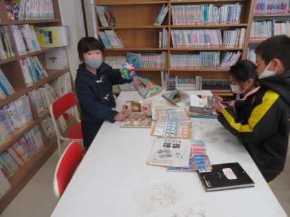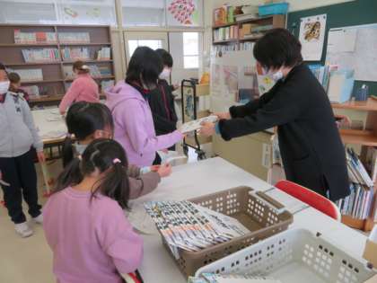 図書館司書の先生のアイディアで始まった「本の福袋」。図書館を訪れ、アンケートを書いた人から先着順で、「本の福袋」が配られました。中身は、お勧めの本やプレゼント、貸出券など。子供たちに大人気で、用意していた40袋は、あっという間に売り切れてしまいました。