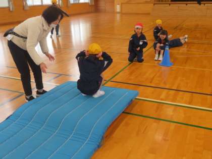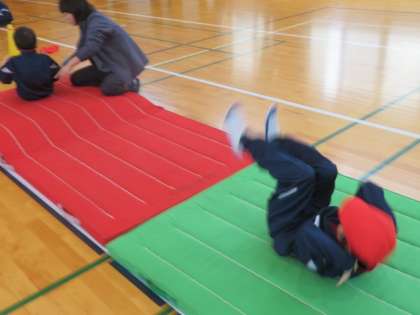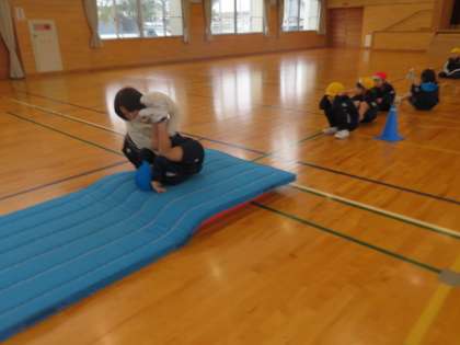 先生に補助をしてもらいながら、後ろ回りの練習をしています。両手をマットにしっかりついて、勢いよく回ることができる人もいました。