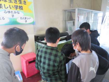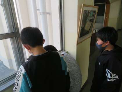 校舎内の汚れた箇所を見付け、感謝の気持ちも込めてきれいにしようという学習が始まりました。まずは、学校中を巡回し、汚れポイントを見付けています。