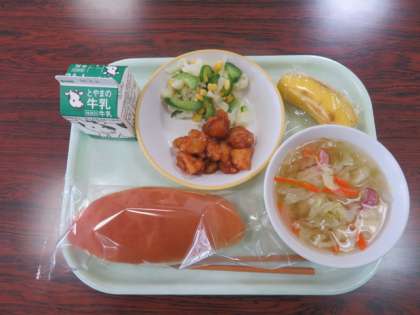 2月1日(火) 今日の給食 公開日 2022/02/01 更新日 2022/02/01 学校 行事 今日の献立は、コッペパン 鶏肉のマーマレードソースがけ キャベツスープ フレンチサラダ バナナ 牛乳 でした。