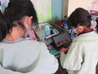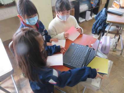 卒業をお祝いする飾りを作っています。折り紙は、動画で折り方を参考にしながら花を作っています。
