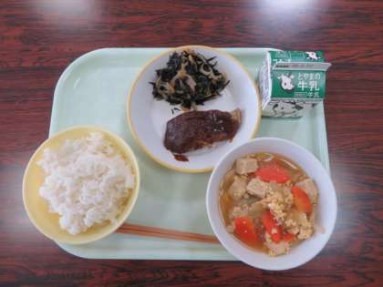 今日の献立は、ご飯 高野豆腐の卵とじ 魚の甘味噌かけ ひじきと小松菜の炒めに 牛乳 でした。