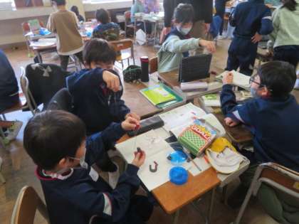 磁石に付けた鉄はどうなるのか、実験しました。磁石から離した釘に他の釘が何本付くのか、どのくらいの時間付くのかなど、確かめていました。