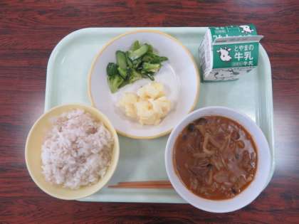 今日の献立は、麦ご飯 ビーフストロガノフ チーズポテト グリーンサラダ 牛乳 でした。