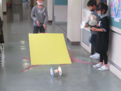 紙皿を車のタイヤのように貼り合わせて坂の上から転がしました。遠くまで上手に転がすためには、こつがいりそうです。