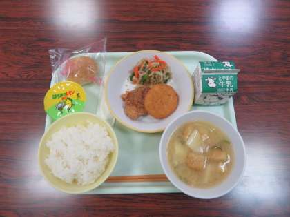 今日は選択献立でした。ご飯 みそ汁 豚肉の竜田揚げまたは、えびかつ いちごのシュークリームまたは、はちみつレモンゼリー 牛乳 でした。