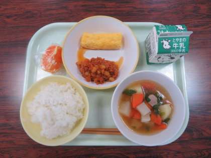 今日の献立は、ご飯 野菜のスープ煮 卵ロール 白インゲン豆トマト味 甘ぺい 牛乳 でした。