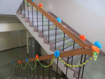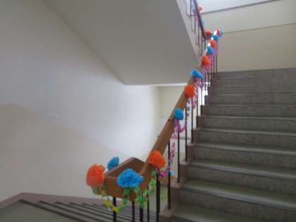 階段に、1〜5年生が作った輪飾りや紙花が飾られました。卒業を祝う環境つくりも少しずつ進行中です。