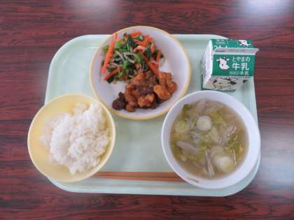今日の献立は、 ご飯 たら汁 鶏肉とレバーのカレーふうみ 小松菜のナムル 牛乳 でした。
