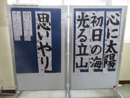 学年の代表として、富山県小・中・高校生書初大会に出品した作品を児童玄関前に廊下に展示しました。どれも字形がよく勢いがある素敵な作品です。