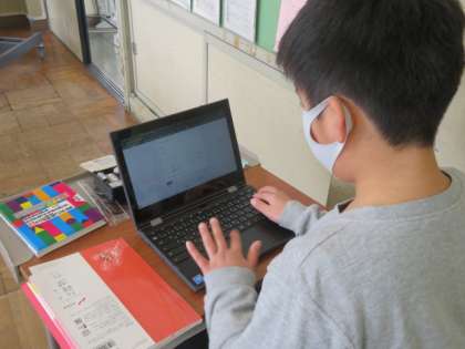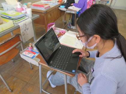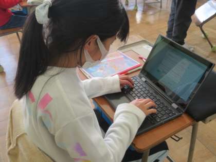 友達がPCで作ったアンケートにお互いに早速記入。自分が提案したアンケートの集計結果をもとに、意見文をまとめていきます。