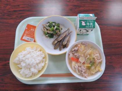 2月24日(木) 今日の給食 公開日 2022/02/24 更新日 2022/02/24 学校 行事 今日の献立は、 ご飯 白ごまと豆乳うどん 小あじの唐揚げ 菜花ひたし 穀物ふりかけ 牛乳 で した。