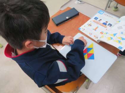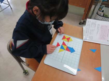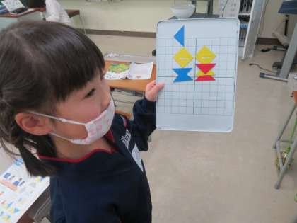 色板を組み合わせて、いろいろな形を作っています。上手に作ることはできたでしょうか。