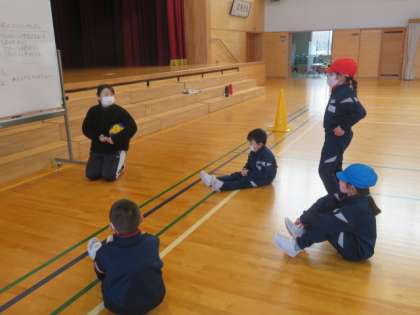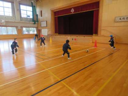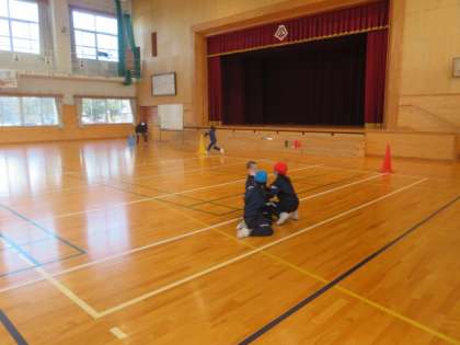 攻撃する人の蹴ったボールに守備をする全員が集まって座る間に、蹴った人がどこまで走れるかで点数を競い合っています。守り方や蹴る方向や強さがポイントとなってきます。ゲームの後は、振り返りも行いました。