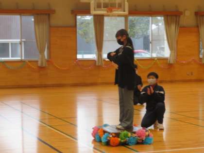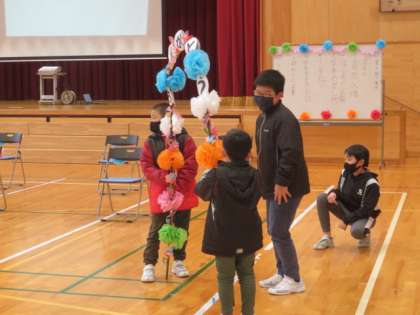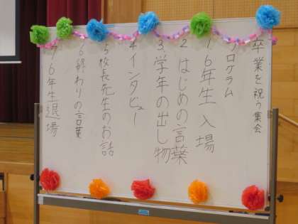 延期になっていた卒業を祝う会が行われました。4・5年生を中心に、全校児童で作った輪飾りや花紙のアーチでに囲まれながら、6年生が入場し、一人一人お立ち台に上っての紹介タイムです。