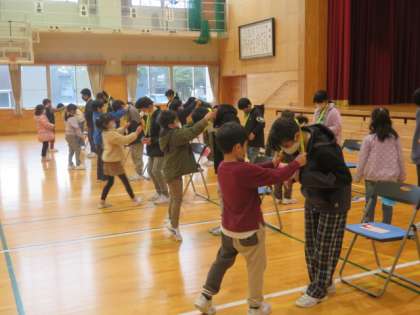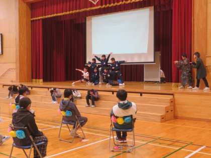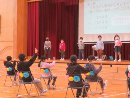 1〜3年生はmメダル渡しや歌、クイズに劇を通して6年生との思い出や素敵な姿を紹介しました。