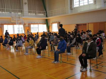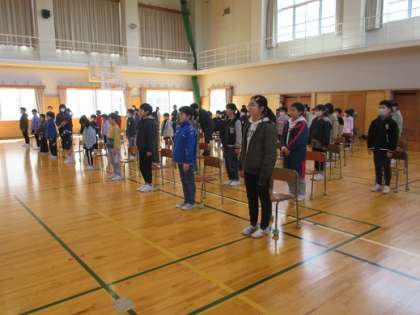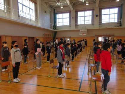 卒業式には、在校生全員が参加します。間隔を空けて座席を決めたり、1題目だけ歌う校歌や全校合唱、よびかけの練習をしたりしました。立っているときや椅子に座っているときの姿勢も立派でした。