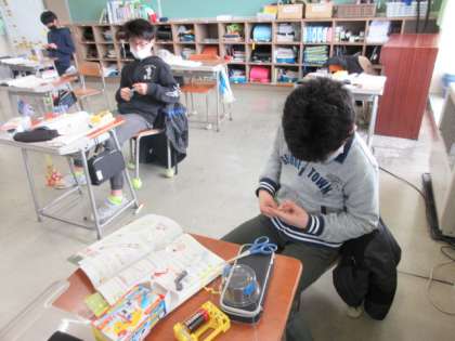 鉄芯のない電磁石を使ってモーター作りに挑戦しています。上手く回る人もでできました。