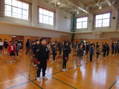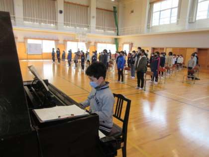 2回目の在校生卒業式の練習です。全校で歌う校歌や合唱曲も、マイクを着けながらですが、響いてきました。