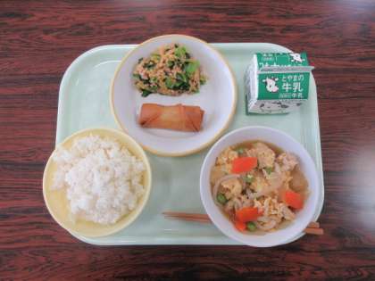 今日の献立は、ご飯 親子煮 春巻き 納豆和え 牛乳 でした。