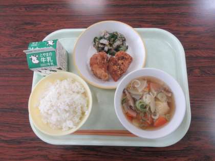 今日の献立は、ご飯 鶏肉の竜田揚げ けんちん汁 ゆかり和え でした。